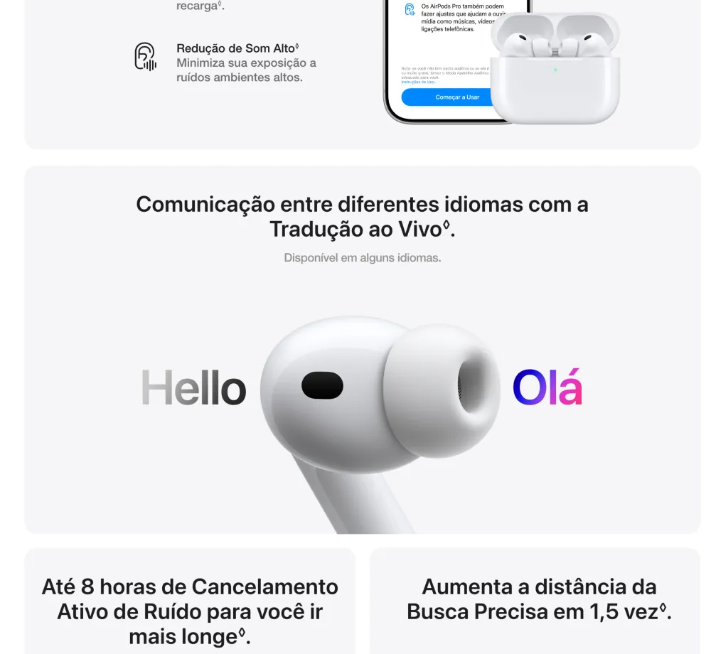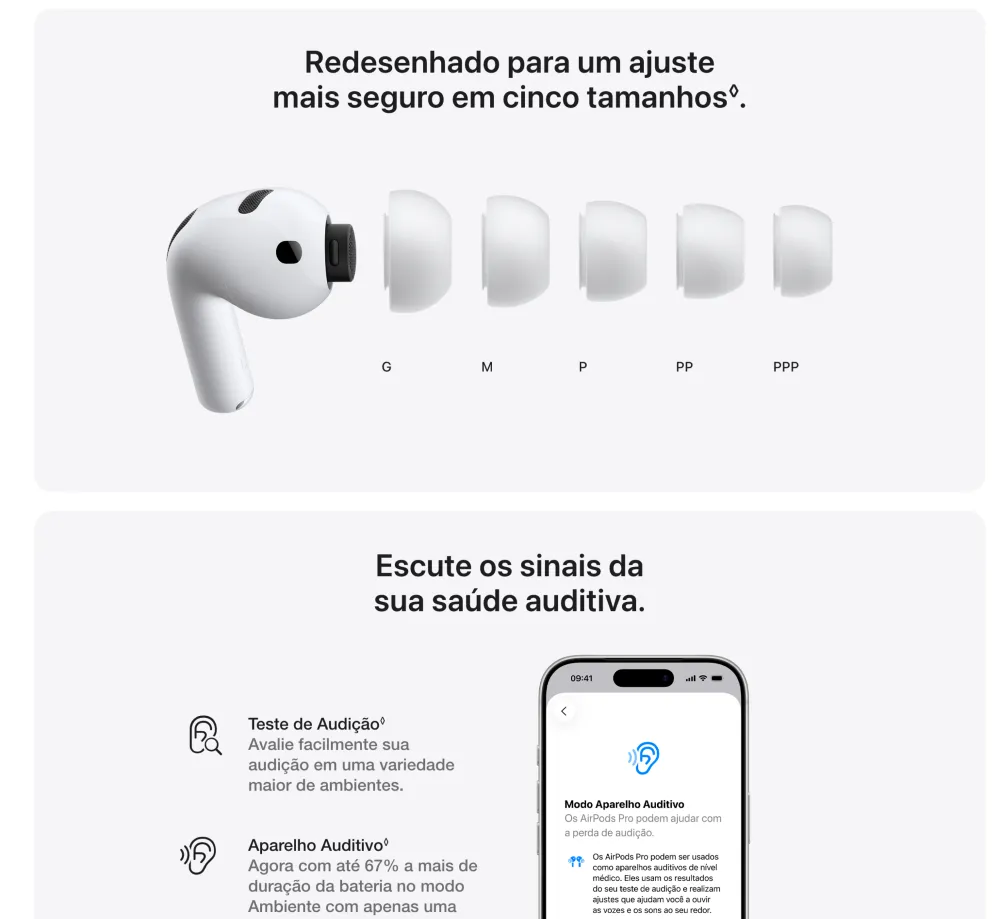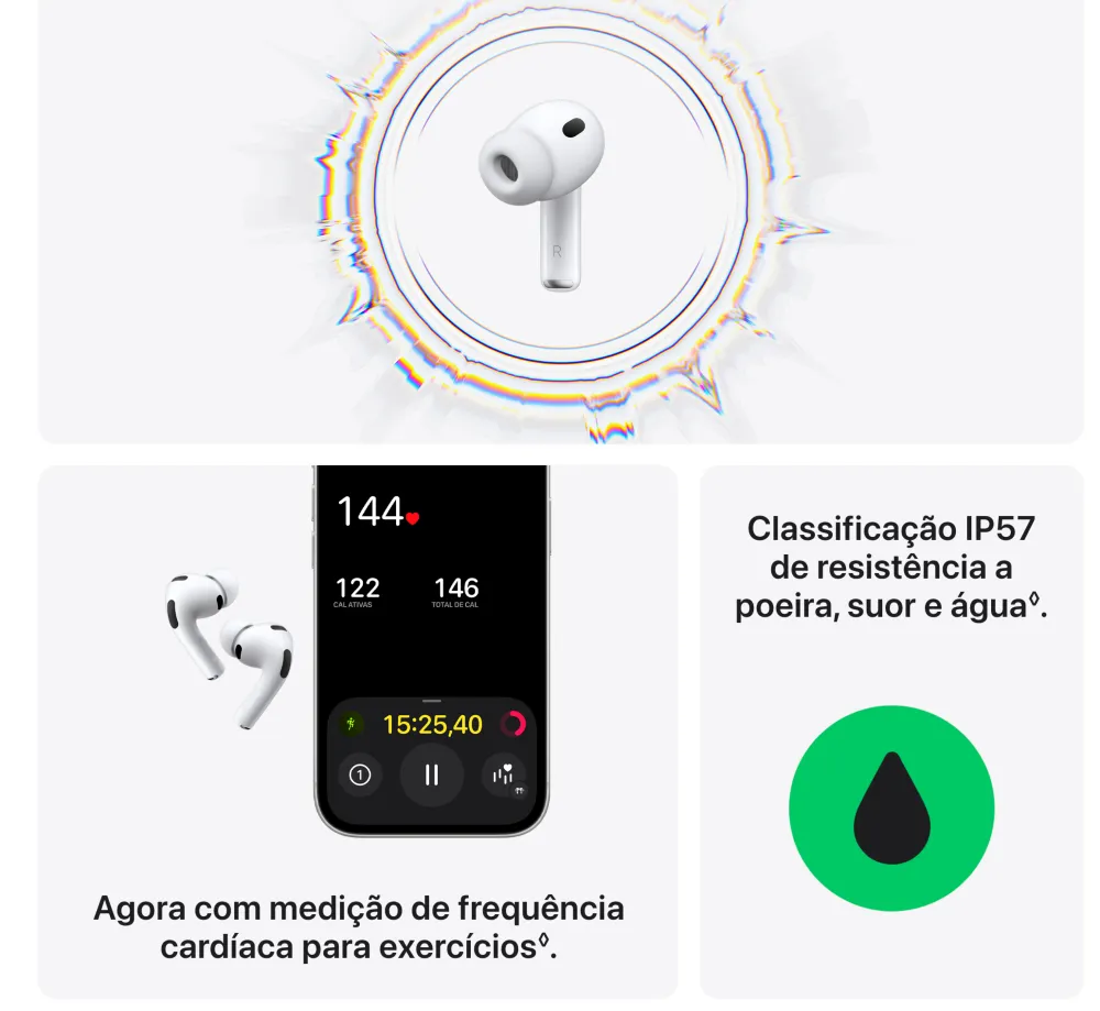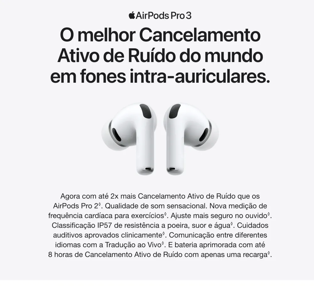 AirPods Pro 3. Cancelamento Ativo de Ruído até duas vezes melhor que o dos AirPods Pro 2¹. Agora com medição de frequência cardíaca², Tradução ao Vivo³, maior duração da bateria⁴ e avanços em saúde auditiva⁵. Redesenhado para um ajuste mais seguro⁴. • O MELHOR CANCELAMENTO ATIVO DE RUÍDO DO MUNDO EM FONES INTRA-AURICULARES — Remove até duas vezes mais ruído indesejado que os AirPods Pro 2 para você se concentrar no que estiver fazendo¹. • DESEMPENHO DE ÁUDIO REVOLUCIONÁRIO — Os AirPods Pro 3 oferecem uma experiência de áudio tridimensional de tirar o fôlego. A nova arquitetura acústica transforma os graves, traz mais clareza para você ouvir cada instrumento e deixa os vocais com uma profundidade incrível. • MEDIÇÃO DE FREQUÊNCIA CARDÍACA — A medição de frequência cardíaca integrada permite acompanhar seus batimentos e as calorias queimadas em até 50 tipos de exercício². Com o iPhone, você tem acesso ao círculo de Movimento, contagem de passos e o novo Workout Buddy⁶, com a potência da Apple Intelligence⁷. • TRADUÇÃO AO VIVO — Com a Apple Intelligence⁷, você se comunica sem barreiras usando a Tradução ao Vivo³. • MAIOR DURAÇÃO DA BATERIA — São até 8 horas de áudio com Cancelamento Ativo de Ruído com apenas uma recarga⁸. Ou até 10 horas no modo Ambiente usando o modo Aparelho Auditivo⁹. • AJUSTE SEGURO NOS OUVIDOS — As novas pontas, agora em cinco tamanhos, oferecem um ajuste mais seguro e melhor desempenho acústico geral⁴. • SAÚDE AUDITIVA — Faça um Teste de Audição no conforto de casa¹⁰. Use o modo Aparelho Auditivo para se comunicar com mais clareza¹¹. E a Redução de Som Alto para minimizar sua exposição a ruídos ambientes altos. • ÁUDIO PERSONALIZADO — A Equalização Adaptativa de última geração customiza o som de acordo com a anatomia e o encaixe nos seus ouvidos. E microfones voltados para dentro detectam o que você está ouvindo para fazer ajustes em tempo real. • FUNCIONA COMO MÁGICA — Com o Pareamento Dinâmico, você alterna facilmente entre seus aparelhos Apple¹². E com o Compartilhamento de Áudio, você conecta num instante até dois pares de AirPods no seu iPhone, iPad ou Apple TV para ouvir música ou assistir a uma série com mais alguém¹³. Saúde Auditiva en los AirPods Pro 3 AirPods Pro 3. Faça um Teste de Audição e use o modo Aparelho Auditivo¹⁴ com até 10 horas de bateria no modo Ambiente¹⁵ com Redução de Som Alto. Tudo em uma experiência integrada. Também com o melhor Cancelamento Ativo de Ruído do mundo em fones intra-auriculares¹⁶, medição de frequência cardíaca para exercícios¹⁷ e um ajuste excepcional. Aviso legal 1. Testes conduzidos pela Apple em julho de 2025 usando AirPods Pro 3 emparelhados com iPhone 16 com firmware dos AirPods em versão preliminar e iOS 26. A redução de ruído foi testada de acordo com a norma IEC 60268-24. A comparação foi feita com os fones de ouvido sem fio intra-auriculares mais vendidos disponíveis no mercado no momento dos testes. O desempenho depende das configurações do aparelho, do ambiente e de vários outros fatores. 2. O monitor de frequência cardíaca integrado é destinado ao uso durante exercícios com o app Fitness e apps de terceiros compatíveis no iPhone com iOS 26 ou posterior. Consulte support.apple.com/pt-br/ para obter mais informações. 3. A Tradução ao Vivo com AirPods está disponível nos AirPods 4 com Cancelamento Ativo de Ruído e AirPods Pro 2 e posteriores com o firmware mais recente quando emparelhados com um iPhone com iOS 26 e posterior com a Apple Intelligence ativada. Compatível com inglês (Reino Unido, EUA), francês (França), alemão, português (Brasil) e espanhol (Espanha). Para saber mais, consulte Disponibilidade de recursos. 4. Em comparação com os AirPods Pro 2. 5. Compatível com AirPods Pro 2 e posteriores com o firmware mais recente quando emparelhados com um iPhone ou iPad compatível com a versão mais recente do sistema operacional. Os recursos Aparelho Auditivo e Proteção de Audição também estão disponíveis no Mac com a versão mais recente do software. Consulte support.apple.com/pt-br/120850 para saber sobre atenuação total e mais informações sobre o recurso Proteção de Audição. 6. Requer um iPhone por perto com a Apple Intelligence ativada e fones de ouvido Bluetooth com o idioma do aparelho e da Siri configurados em inglês. A Apple Intelligence está disponível em versão beta. Alguns recursos podem não estar disponíveis em todas as regiões ou idiomas. Para ver a disponibilidade de recursos e idiomas, e os requisitos do sistema, acesse support.apple.com/pt-br/121115. 7. A Apple Intelligence está disponível em versão beta. Alguns recursos podem não estar disponíveis em todas as regiões ou idiomas. Para ver a disponibilidade de recursos e idiomas, e os requisitos do sistema, acesse support.apple.com/pt-br/121115. 8. Testes conduzidos pela Apple em julho e agosto de 2025 usando unidades em pré-produção dos AirPods Pro 3 com estojo de recarga MagSafe emparelhadas com unidades em pré-produção do iPhone 17 Pro e software em versão preliminar. A playlist compreendia 358 faixas diferentes adquiridas na iTunes Store (codificação AAC de 256 Kbps). O volume foi ajustado para 50%, e o Cancelamento Ativo de Ruído estava ativado. Com as opções Áudio Espacial e Rastreamento da Cabeça ativadas, o tempo de áudio foi de até 7,5 horas. Os testes realizaram a descarga total da bateria dos AirPods Pro, executando áudio até a reprodução do primeiro AirPod Pro ser interrompida. A duração da bateria depende das configurações do aparelho, do uso, do ambiente e de vários outros fatores. 9. Testes conduzidos pela Apple em julho e agosto de 2025 usando unidades em pré-produção dos AirPods Pro 3 com estojo de recarga MagSafe emparelhadas com unidades em pré-produção do iPhone 17 Pro e 