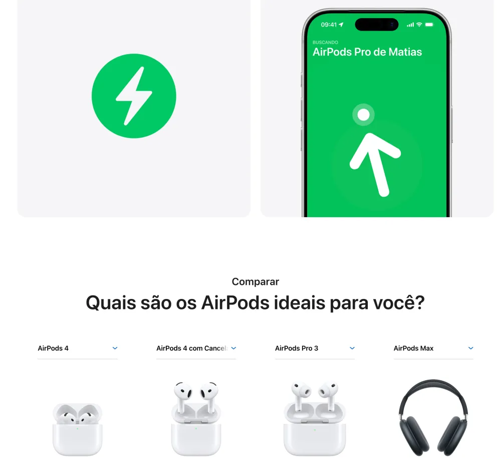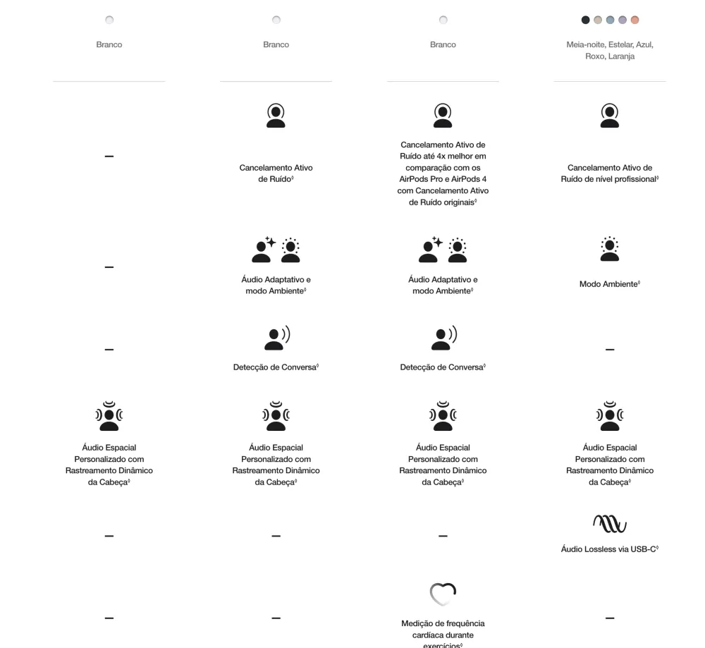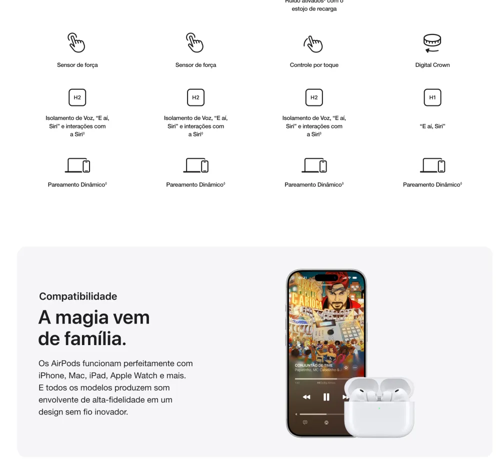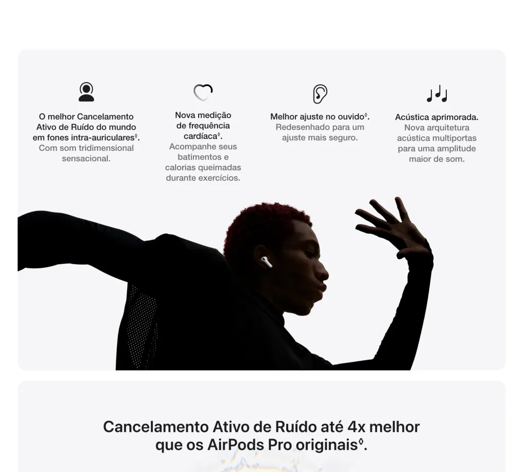 AirPods Pro 3. Cancelamento Ativo de Ruído até duas vezes melhor que o dos AirPods Pro 2¹. Agora com medição de frequência cardíaca², Tradução ao Vivo³, maior duração da bateria⁴ e avanços em saúde auditiva⁵. Redesenhado para um ajuste mais seguro⁴. • O MELHOR CANCELAMENTO ATIVO DE RUÍDO DO MUNDO EM FONES INTRA-AURICULARES — Remove até duas vezes mais ruído indesejado que os AirPods Pro 2 para você se concentrar no que estiver fazendo¹. • DESEMPENHO DE ÁUDIO REVOLUCIONÁRIO — Os AirPods Pro 3 oferecem uma experiência de áudio tridimensional de tirar o fôlego. A nova arquitetura acústica transforma os graves, traz mais clareza para você ouvir cada instrumento e deixa os vocais com uma profundidade incrível. • MEDIÇÃO DE FREQUÊNCIA CARDÍACA — A medição de frequência cardíaca integrada permite acompanhar seus batimentos e as calorias queimadas em até 50 tipos de exercício². Com o iPhone, você tem acesso ao círculo de Movimento, contagem de passos e o novo Workout Buddy⁶, com a potência da Apple Intelligence⁷. • TRADUÇÃO AO VIVO — Com a Apple Intelligence⁷, você se comunica sem barreiras usando a Tradução ao Vivo³. • MAIOR DURAÇÃO DA BATERIA — São até 8 horas de áudio com Cancelamento Ativo de Ruído com apenas uma recarga⁸. Ou até 10 horas no modo Ambiente usando o modo Aparelho Auditivo⁹. • AJUSTE SEGURO NOS OUVIDOS — As novas pontas, agora em cinco tamanhos, oferecem um ajuste mais seguro e melhor desempenho acústico geral⁴. • SAÚDE AUDITIVA — Faça um Teste de Audição no conforto de casa¹⁰. Use o modo Aparelho Auditivo para se comunicar com mais clareza¹¹. E a Redução de Som Alto para minimizar sua exposição a ruídos ambientes altos. • ÁUDIO PERSONALIZADO — A Equalização Adaptativa de última geração customiza o som de acordo com a anatomia e o encaixe nos seus ouvidos. E microfones voltados para dentro detectam o que você está ouvindo para fazer ajustes em tempo real. • FUNCIONA COMO MÁGICA — Com o Pareamento Dinâmico, você alterna facilmente entre seus aparelhos Apple¹². E com o Compartilhamento de Áudio, você conecta num instante até dois pares de AirPods no seu iPhone, iPad ou Apple TV para ouvir música ou assistir a uma série com mais alguém¹³. Saúde Auditiva en los AirPods Pro 3 AirPods Pro 3. Faça um Teste de Audição e use o modo Aparelho Auditivo¹⁴ com até 10 horas de bateria no modo Ambiente¹⁵ com Redução de Som Alto. Tudo em uma experiência integrada. Também com o melhor Cancelamento Ativo de Ruído do mundo em fones intra-auriculares¹⁶, medição de frequência cardíaca para exercícios¹⁷ e um ajuste excepcional. Aviso legal 1. Testes conduzidos pela Apple em julho de 2025 usando AirPods Pro 3 emparelhados com iPhone 16 com firmware dos AirPods em versão preliminar e iOS 26. A redução de ruído foi testada de acordo com a norma IEC 60268-24. A comparação foi feita com os fones de ouvido sem fio intra-auriculares mais vendidos disponíveis no mercado no momento dos testes. O desempenho depende das configurações do aparelho, do ambiente e de vários outros fatores. 2. O monitor de frequência cardíaca integrado é destinado ao uso durante exercícios com o app Fitness e apps de terceiros compatíveis no iPhone com iOS 26 ou posterior. Consulte support.apple.com/pt-br/ para obter mais informações. 3. A Tradução ao Vivo com AirPods está disponível nos AirPods 4 com Cancelamento Ativo de Ruído e AirPods Pro 2 e posteriores com o firmware mais recente quando emparelhados com um iPhone com iOS 26 e posterior com a Apple Intelligence ativada. Compatível com inglês (Reino Unido, EUA), francês (França), alemão, português (Brasil) e espanhol (Espanha). Para saber mais, consulte Disponibilidade de recursos. 4. Em comparação com os AirPods Pro 2. 5. Compatível com AirPods Pro 2 e posteriores com o firmware mais recente quando emparelhados com um iPhone ou iPad compatível com a versão mais recente do sistema operacional. Os recursos Aparelho Auditivo e Proteção de Audição também estão disponíveis no Mac com a versão mais recente do software. Consulte support.apple.com/pt-br/120850 para saber sobre atenuação total e mais informações sobre o recurso Proteção de Audição. 6. Requer um iPhone por perto com a Apple Intelligence ativada e fones de ouvido Bluetooth com o idioma do aparelho e da Siri configurados em inglês. A Apple Intelligence está disponível em versão beta. Alguns recursos podem não estar disponíveis em todas as regiões ou idiomas. Para ver a disponibilidade de recursos e idiomas, e os requisitos do sistema, acesse support.apple.com/pt-br/121115. 7. A Apple Intelligence está disponível em versão beta. Alguns recursos podem não estar disponíveis em todas as regiões ou idiomas. Para ver a disponibilidade de recursos e idiomas, e os requisitos do sistema, acesse support.apple.com/pt-br/121115. 8. Testes conduzidos pela Apple em julho e agosto de 2025 usando unidades em pré-produção dos AirPods Pro 3 com estojo de recarga MagSafe emparelhadas com unidades em pré-produção do iPhone 17 Pro e software em versão preliminar. A playlist compreendia 358 faixas diferentes adquiridas na iTunes Store (codificação AAC de 256 Kbps). O volume foi ajustado para 50%, e o Cancelamento Ativo de Ruído estava ativado. Com as opções Áudio Espacial e Rastreamento da Cabeça ativadas, o tempo de áudio foi de até 7,5 horas. Os testes realizaram a descarga total da bateria dos AirPods Pro, executando áudio até a reprodução do primeiro AirPod Pro ser interrompida. A duração da bateria depende das configurações do aparelho, do uso, do ambiente e de vários outros fatores. 9. Testes conduzidos pela Apple em julho e agosto de 2025 usando unidades em pré-produção dos AirPods Pro 3 com estojo de recarga MagSafe emparelhadas com unidades em pré-produção do iPhone 17 Pro e 